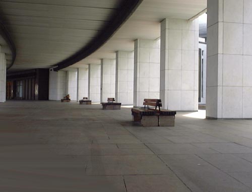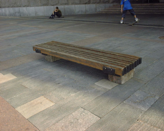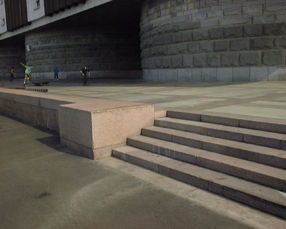 (+) Много ступенек различной высоты, граней. Множество хороших не очень высоких выступов для красивых manual'ов. Можно кататься в дождь или в жару под крышей. Мраморные плиты с узкими швами. Культовое место для московских скейтеров.