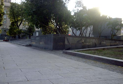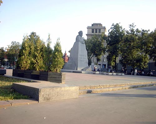 (-) Много пешеходов, рядом дорога. В жаркие дни асфальт рядом с памятником плавится. Милиция пробегает.